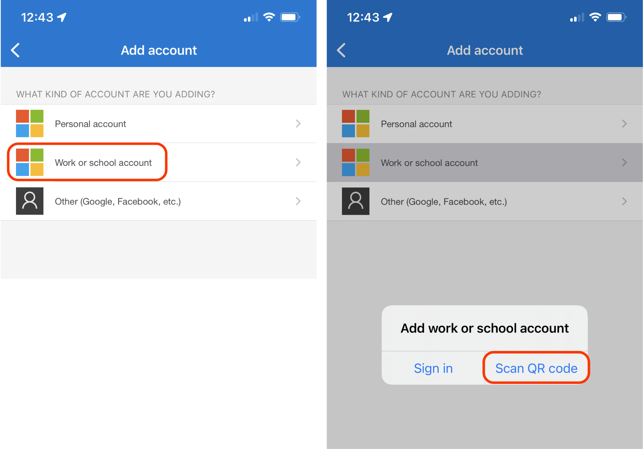 - Tap Add a work or school account and choose Scan QR code.