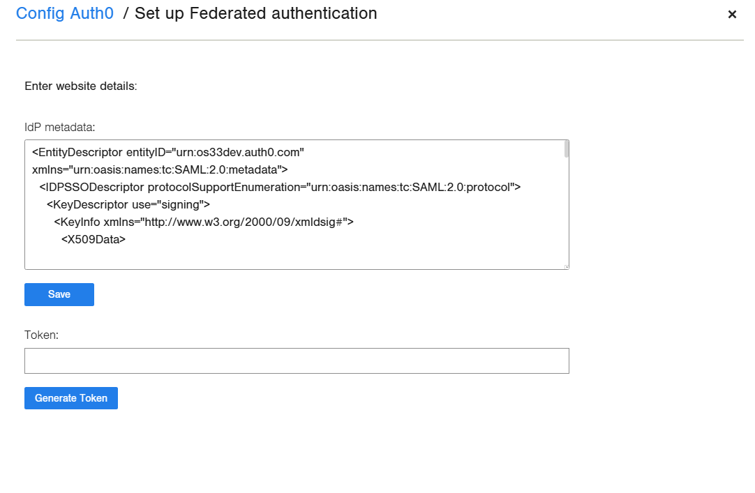 Click Auth0 in the websites list, click Edit Identity Provider, and upload the contents of the XML file in the IdP metadata field.